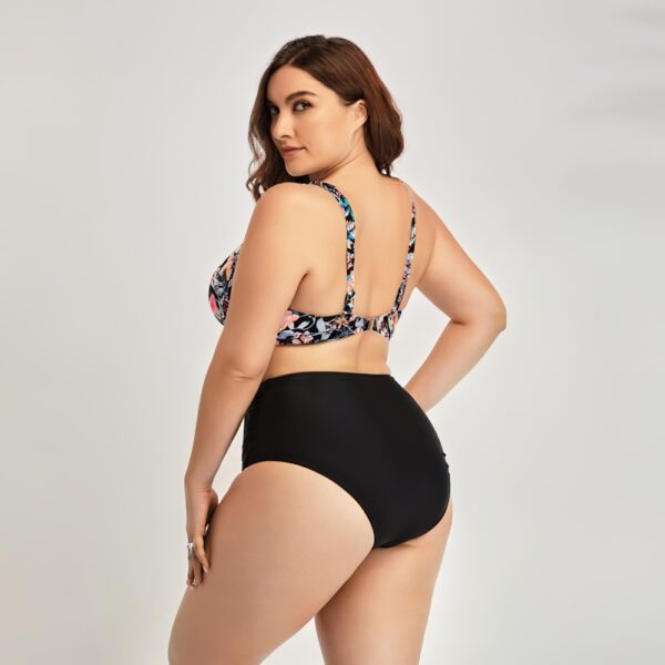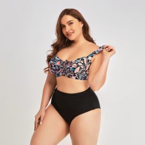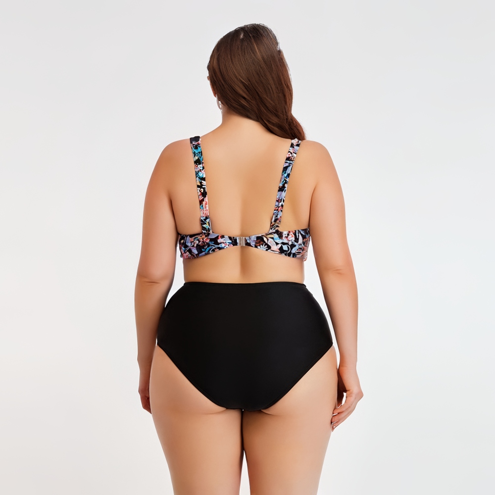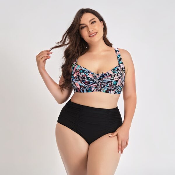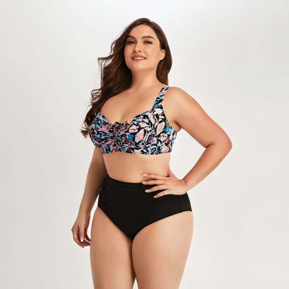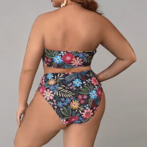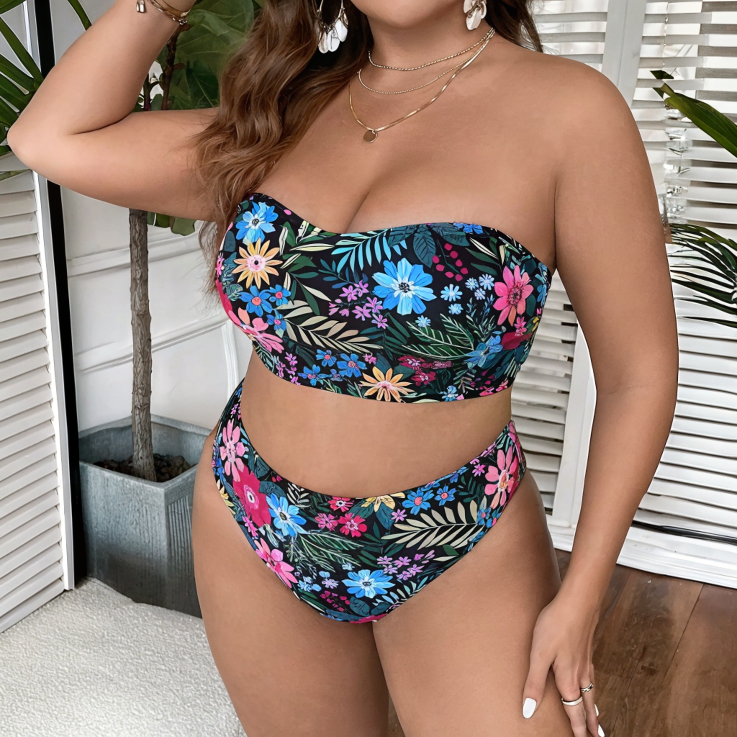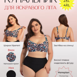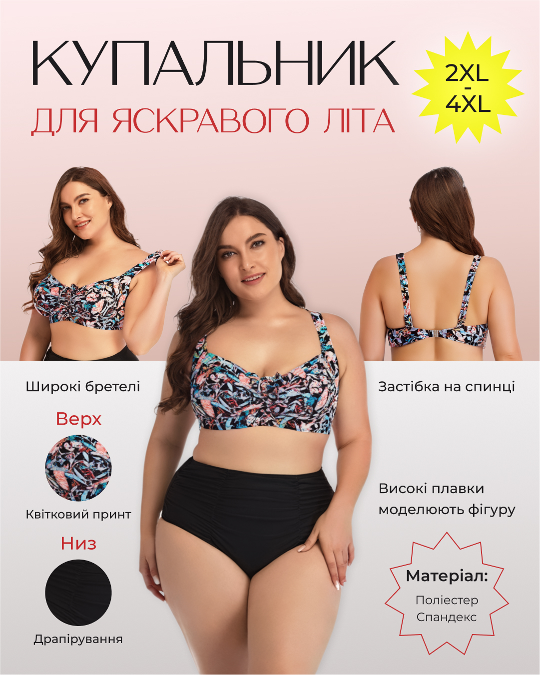 Роздільний купальник плюс сайз топ бандо та плавки з високою талією яскравий квітковий принт 429-05